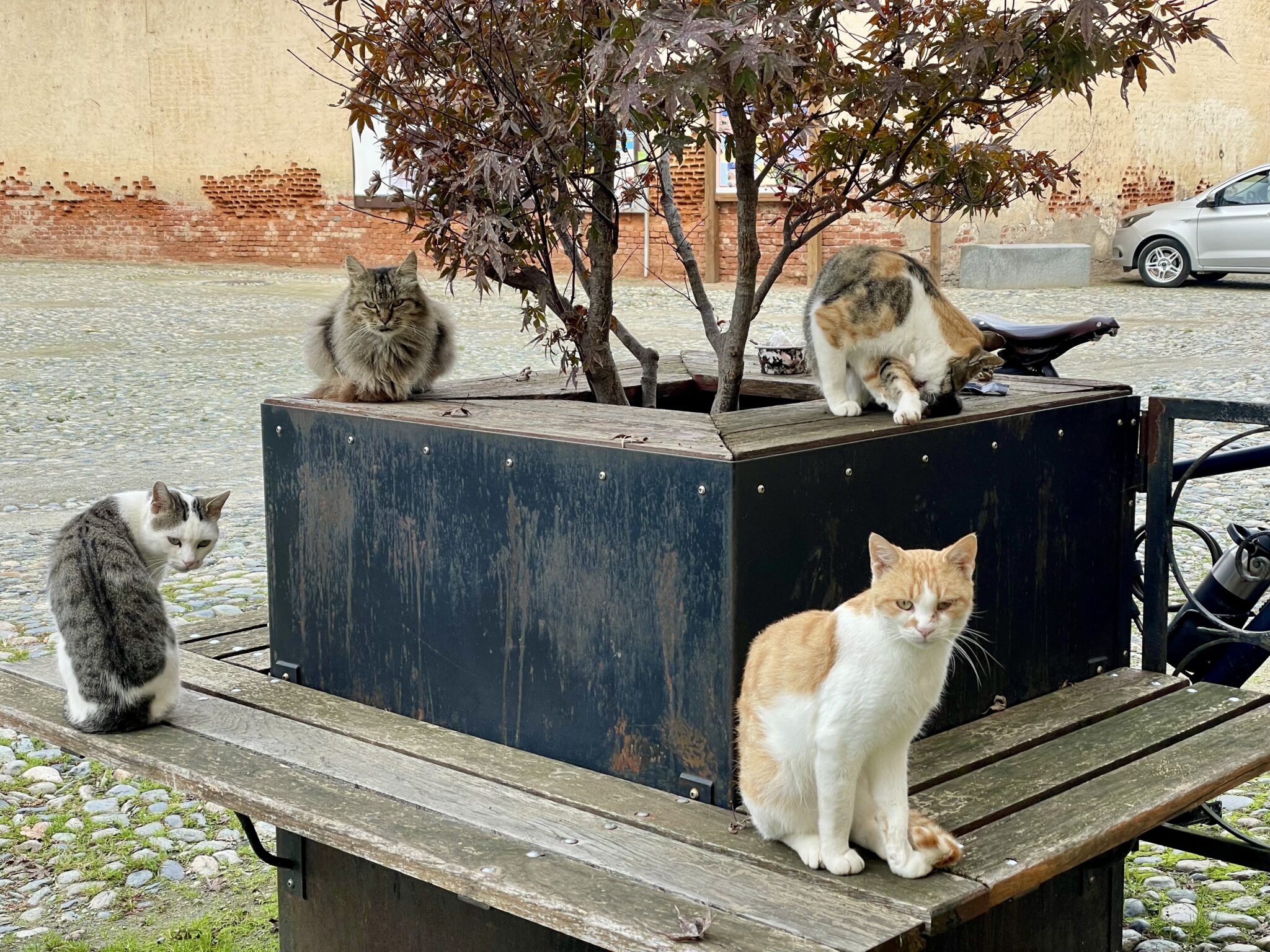 Ebenfalls unterwegs fuhren wir durch eine Klostersiedlung mit einem herzigen Café. Die Mönche sind aber durch andere Lebewesen ersetzt worden. Wie kontrolliert das Wachstum der neuen Population vor sich geht, ist etwas unklar. Auf jeden seltenen Fall ein italienisches Café ohne Tauben. Warum bloss?