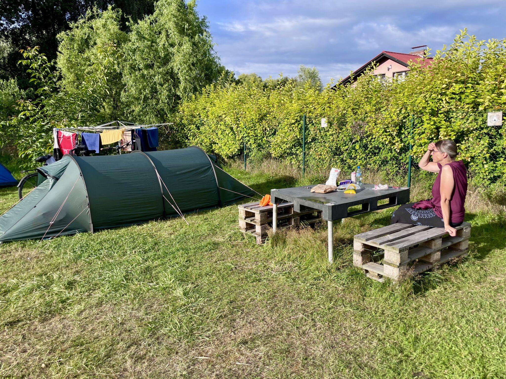 Unerwartet entscheiden sich die beiden Todesmutigen in diesem Gebiet für einmal im Zelt zu schlafen, das bereits 700 km ungenutzt mitfährt. Lustigerweise sind auch alle Teile mit dabei, ohne dass sie das zu Hause überprüft hatten. Auf dem Campingwieschen ist bereits ein junger polnischer Velofahrer, der auf dem Weg zum Nordkapp ist und gut Englisch spricht. Er ist sehr interessiert, wie uns Polen gefällt, kann uns viele Fragen zu seinem Land beantworten und hilft, unsere Erfahrungen einzuordnen. Etwas später trifft eine holländische Familie mit zwei Jungs (8 und 10 Jahre alt) ein, die wir bereits unterwegs bewunderten und heute 50 km mit dem Fiets (Velo) gefahren sind. Mit ihnen ergibt sich ebenfalls ein reger Austausch, teilweise sogar auf schwizerdütsch, weil sie vier Jahre in Zürich gelebt haben. Die Jungs haben noch sehr viel Energie, um einander zu ärgern und den Eltern Streiche zu spielen (z. B. um den Papa im WC einzuschliessen). Noch etwas später treffen zwei tschechische Velofahrer ein, beide um die 70 Jahre alt, die von der Grenze der baltischen Staaten in der Gegenrichtung unterwegs sind. Mit ihnen ist die Verständigung am schwierigsten lustigsten. Auch nach einem Becherli Slivovice (ihre Morgen- und Abenddesinfektion), verstehen wir sie schlecht missverstehen wir sie gut, können neu Feuer speien.