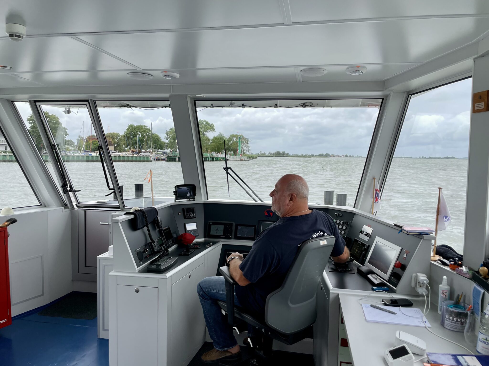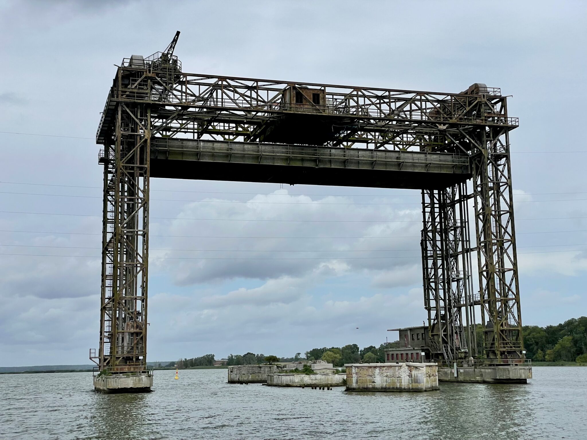 Mit einer fahrenden Solarfähre können wir den Peenestrom von Karnin nach Kamp überqueren. Bis dahin fahren wir mit voller Kraft die letzten 6 km im Gegenwindkanal, damit wir der Fähre nicht nur winken können. Dank meines liebevollen Anfeuerns der beiden und dem nicht so pressanten Kapitän, hat das auch geklappt. Die Fähre schifft noch an einer Hubbrücke (Wikipedia weiss mehr) vorbei, die im 1945 zerstört worden ist. Die beiden Enden wurden gesprengt, die Mitte nach oben gezogen, um den Rückzug abzusichern.