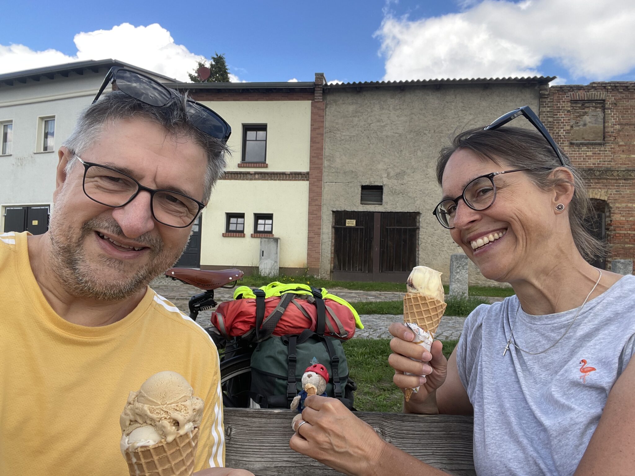 - In Eisenhüttenstadt hat uns ein ca. 75-jähriger Mann auf dem Velo angehalten. Hinten eine Plakette mit allen Ländern, die sein Velo mit ihm schon bereist hat. Er war vor rund 20 Jahren nach China gefahren. Seine Schwerhörigkeit und der Standort neben der Hauptstrasse kürzten den Schwatz etwas ab. Er gab uns aber noch einen guten Tipp für die Route aus der Stadt heraus. Aber es ist so: Velo fahren verbindet!