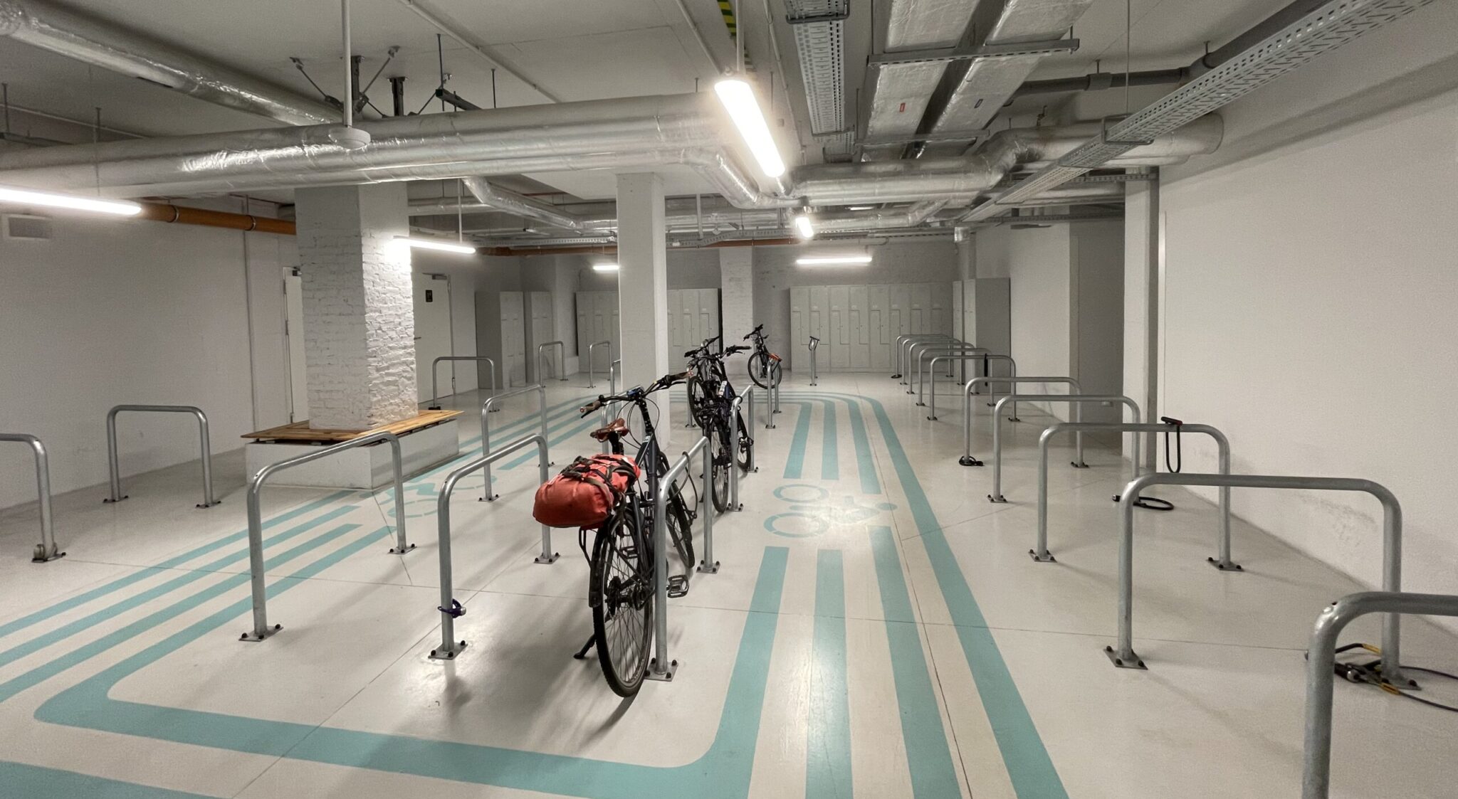 Unser Hotel hat die beste Velogarage, die wir je gesehen haben. Sie ist nicht nur für das Hotel und hat neben den Stellplätzen auch Duschen und Garderobenschränke.