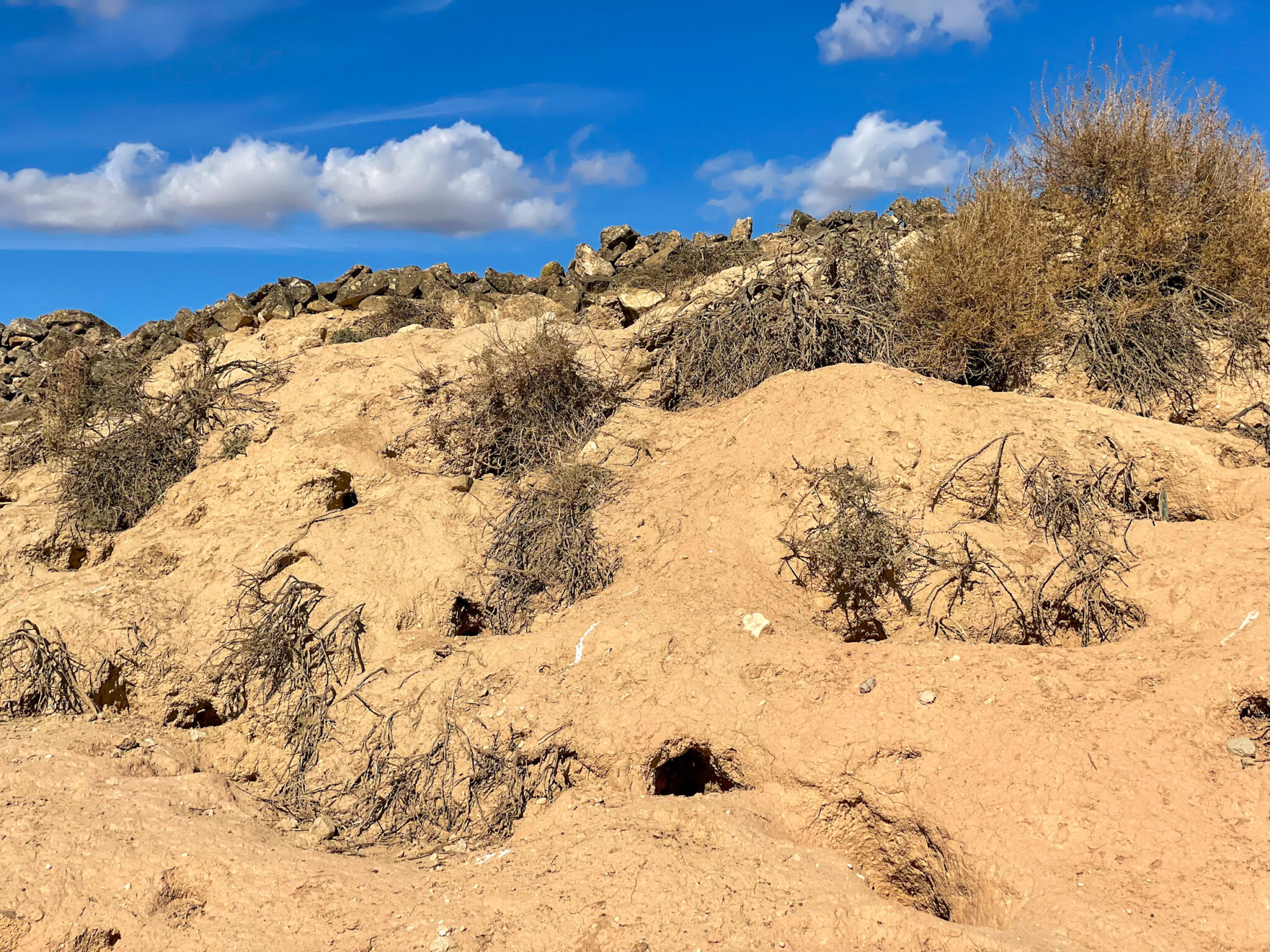 Auch heute nicht viel los mit Interaktionen. Ich beschliesse zumindest am höchsten Punkt, als Belohnung mir an der Tankstelle etwas zu leisten. Aber die ist nicht mehr da, keine Spur von Geschäftsleiter Vater Morgana. Dann doch noch Lebewesen: Auf einem Hügel sitzen vier Hasen. Gerne hätte ich euch die gezeigt, aber nach 10 Minuten, mit Fotoapparat im Anschlag, kann ich nur die Rabbit Holes zeigen: