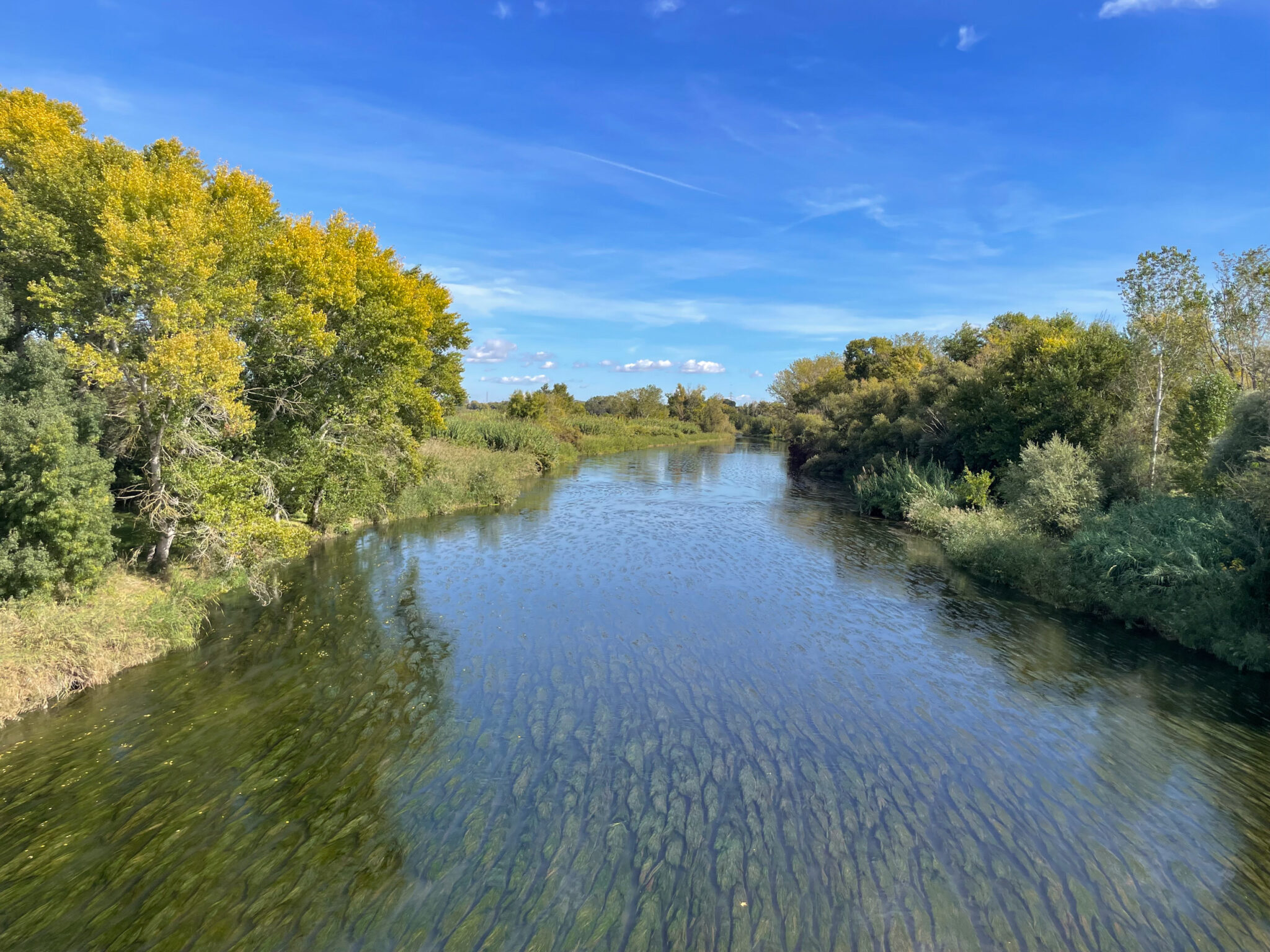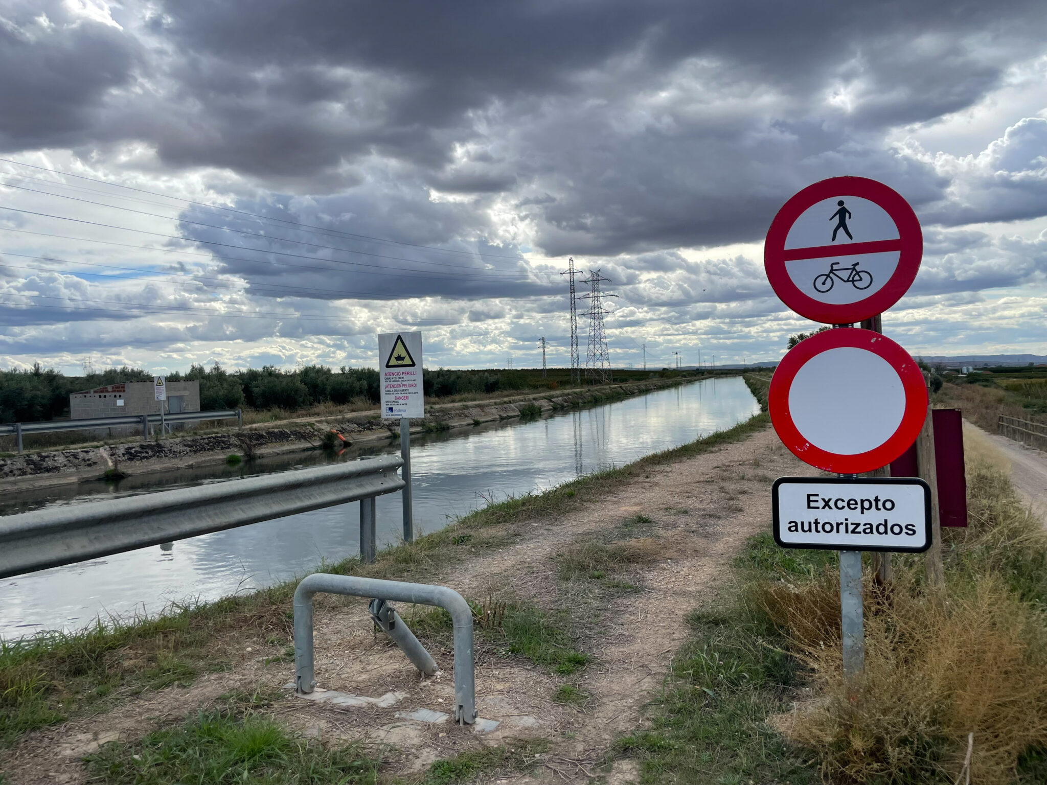 Im Tal des Segre Richtung Lleida gibt es viele Plantagen. Viele davon Pfirsiche, die im Frühjahr wunderschön blühen würden (hab ich natürlich verpasst). Es funktioniert nur mit Bewässerung und im Tal hat es deshalb viele Bewässerungskanäle. Eine Fahrradroute in meinem Navi führt einem solchen entlang. Plötzlich eine Tafel: